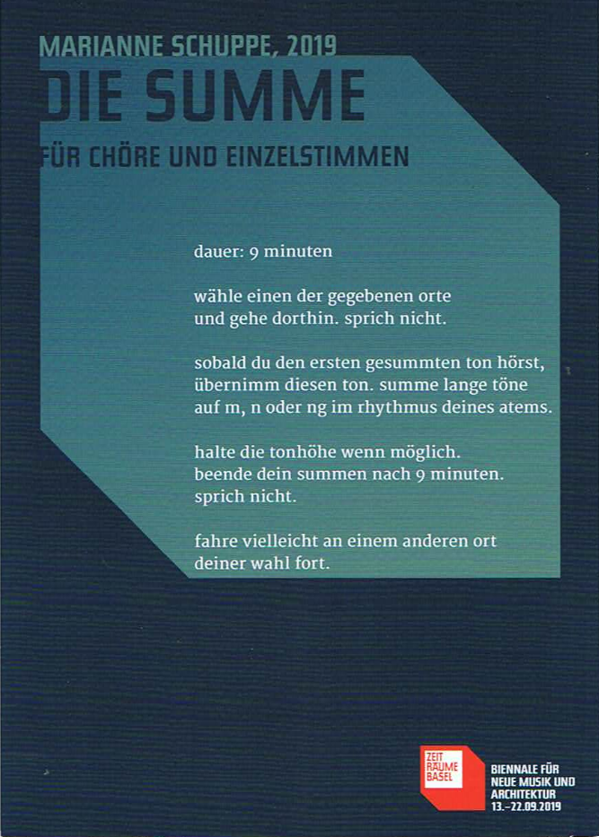 Für die Basler Biennale ZeitRäume entstand 2019 das Stimmenprojekt Die Summe. An zehn öffentlichen Orten in Basel versammelten sich in einem Zeitraum von 10 Tagen zu unterschiedlichen Tageszeiten größere und kleinere Menschengruppen. Sie bildeten jeweils 9 Minuten lang einen klingenden Corpus, indem sie einen einzigen Ton summten, der sich als leise tragende Klangfläche mit den Geräuschen der Stadt mischte. Die Summe dieser 10 Töne ergab eine Melodie, die sich als fluide Skulptur punktuell durch die Stadt Basel zog.